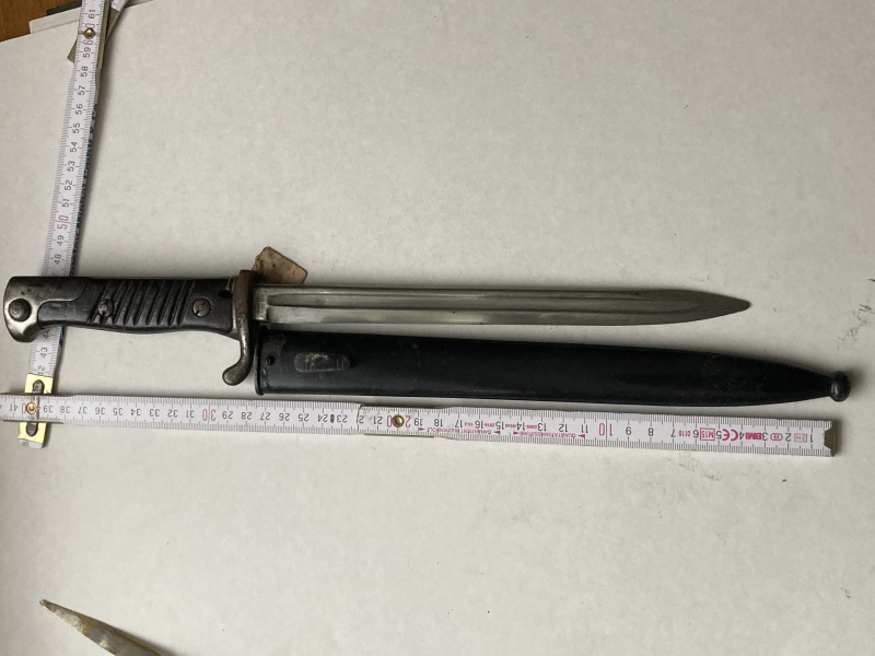 was ich herausfinden konnte ist das das 98/02 der Vorläufer vom 98/02 war, es soll als Notbajonett im Landsturm zum Einsatz gekommen sein, es hatte zuerst eine Lederscheide und bekam dann eine Stahlscheide daher auch die unterschiedlichen breiten, passt aber ganz genau hinein, der Klingenrücken ist abgerundet.