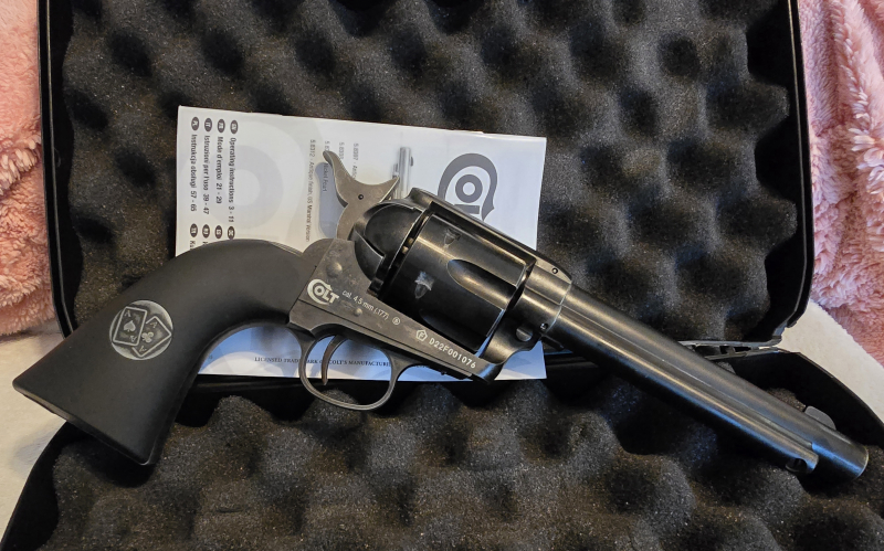 Hallo, biete hier von Colt einen Single action army Revolver in 4,5mm BB in der aces special edition. Der Revolver ist neu und ungeschossen. Top Zustand. Waffe ist aus Metall und hat kein blowback. Mit dabei ein Waffenkoffer, anleitung und 6 patronenhülsen.