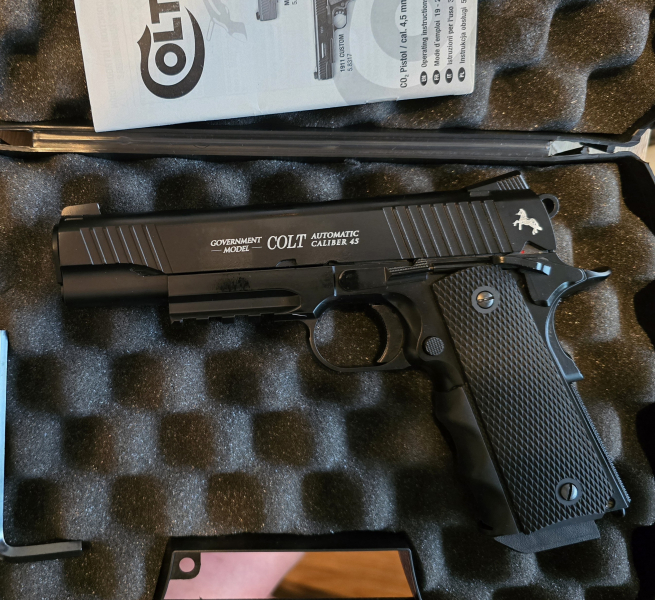 Hallo, biete hier von Colt eine m45 CQBP 1911 in 4,5mm BB in schwarz. Die waffe ist im sehr guten gebrauchten zustand und würde wenig geschossen. Waffe ist aus Metall und hat blowback. Ausserdem sind combat griffschalen einlagen verbaut, können jederzeit entnommen werden. Mit dabei ein Waffenkoffer, anleitung und ein sechskantschlüssel.