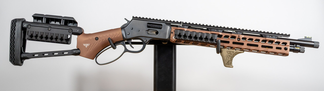 Vorführwaffe mit geringer Schussbelastung (< 50 Schuss in .38 Special). Henry Repeating Arms – Big Boy X, Kaliber .357 Magnum / .38 Special, Herstellernummer H012MX. Robustes, aufgerüstetes Modell mit modernem Schaft- und Handschutz-System sowie umfangreichem Zubehör. Originalteile sind vollständig vorhanden und werden mitgeliefert.