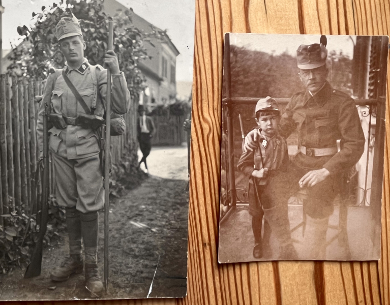 2 Fotos von kuk Infanterist, Vater und Sohn in der Uniform der Kuk Gebirgstruppe mit Kragenedelweiss...