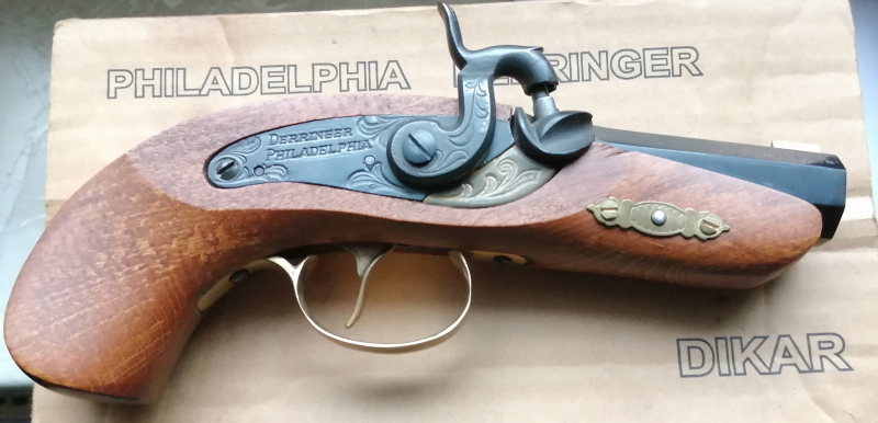 Philadelphia Derringer Vorderlader Pistole im Kaliber 45 von Dikar, Made in Spain mit Original Papp Umkarton und Zertifikat mit Seriennummer, identisch mit der Lauf Gravur, Karton und Zertifikat weisen Gebrauchsspuren auf, da der Derringer ein Jubiläums Geschenk war ist oben auf dem Lauf eine Zeitraum und Vereins Gravur vorhanden, der Derringer ist ungeschossen aber weißt Lagerspuren auf, den Rest zum Zustand bitte den aussagefähigen Fotos entnehmen, die zur Beschreibung dazu gehören.