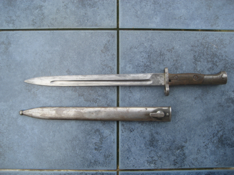 biete aus dem Nachlass einer alten Sammlung ein Bajonett FN Mauser M98/24 Export kurz für Kolumbien (für das FN Gewehr Mod. 24/30). Herst. Fabrique National in Herstal, Belgien. Insges. noch schöner Zustand, kein Rost. Kann durch Aufarbeiten noch verbessert werden. Scheide keine tiefen Rostnarben, nur 2 kleine Minidellchen im vorderen Bereich (Bild 1). Griffschalen geschraubt, Drücker freigängig, keine Markierungen, nur auf dem Griffrücken die Zahlen "0414" schwach zu lesen (Bild 3). (Gesamtl. ca. 45cm, Klingenl. ca. 29,8cm, Ringdurchm. ca. 15,5mm). Das wird nicht so oft angeboten. Privatverkauf, keine Garantie oder Rücknahme. Bilder sind Bestandteiol der Beschreibung. Bitte beachten sie auch meine anderen Auktionen.