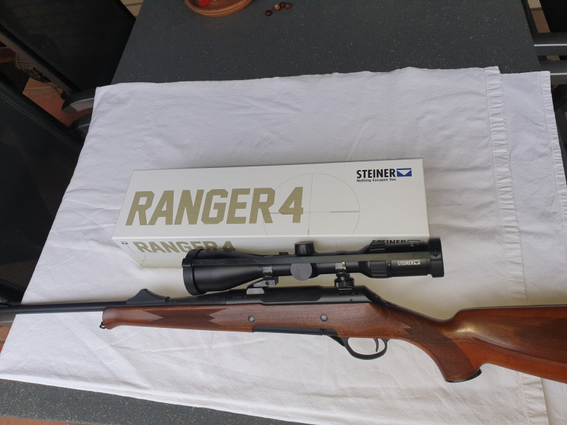 Auf der Waffe montiert: Zielfernrohr Steiner Ranger 4, 3-12X56, Absehen 4 mit einstellbarem Leuchtpunkt auf Schwenkmontage; ZFR ist 3 Jahre alt und hat 10 Jahre Hersteller-Garantie; Rechnung und Papiere werden mitgesandt; Ersatzbatterie für ZFR wird mitgeschickt, damaliger Preis ca. 950,00 Euro ohne Montage.