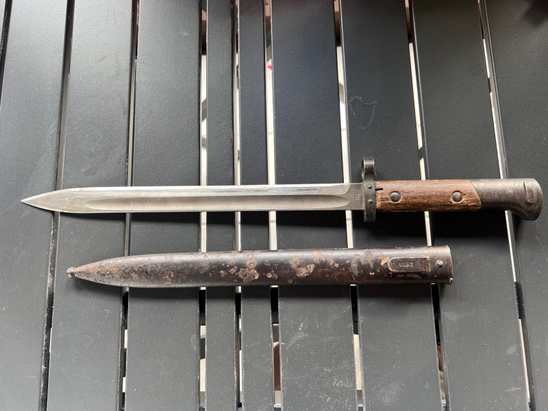Bajonett VZ 24 Export Schneide. Diverse Herstellerstempel auf der Klinge, einige andere Stempel wie abgebildet. Zustand siehe Bilder. Knopf beweglich. Scheide etwas Fleckig, Kinge sehr schöner Zustand.