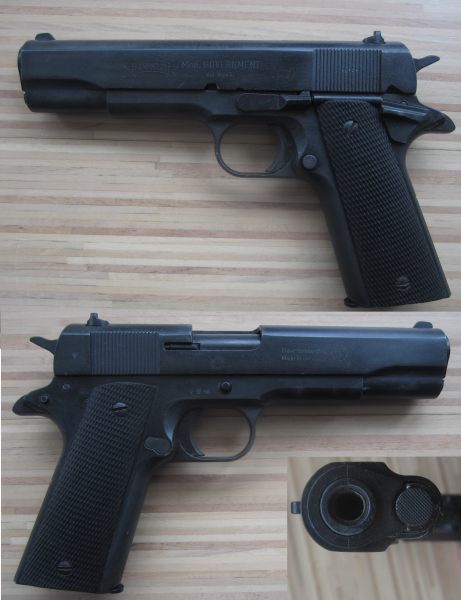 Die Pistole in der Optik einer „Colt 1911“ ist in gebrauchtem Zustand. Die Metallteile sind stellenweise leicht ergraut. Die Pistole trägt die PTB Nr. 531 und wurde 1994 (KE) beschossen. Das Gewinde für den Abschussbecher und die Laufsperre liegen etwas zurück was für eine autentische Optik sorgt. Die Pistole wurde kalt durchrepetiert i.O. Sie ist noch für die alte Gasdruck starke 8mmK Munition ausgelegt. Frei ab 18 Jahre. Privatverkauf von gebrauchter Ware, keine gesetzliche Gewährleistung. Versandkosten 9,5€ (innerhalb der BRD).