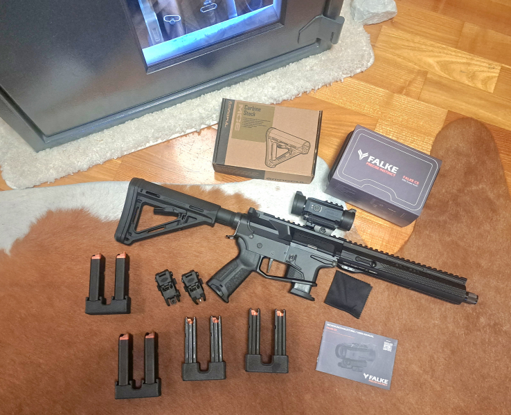 Hera Arms the 9er Gen.3/ Kaliber 9 mm PCC , 10 Zoll, Magpul Schub Schaft, mit gesamt 9 Magazinen und vier Koppler, Colt-System, Kimme und Korn für Picatinny – Schiene mit Falke CS 4x20 Absehen siehe bitte Bild Zustand siehe bitte auch Bilder.