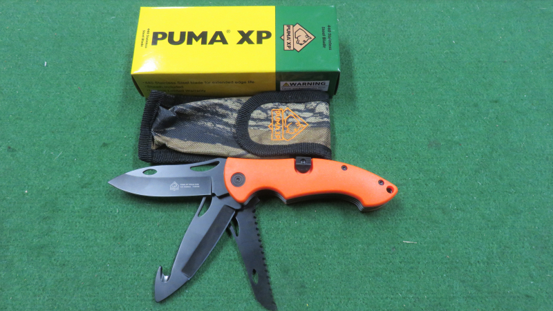 1 Puma XP Messer " Trifecta Orange" das Messer besitzt 3 Klingen einmal normale Klinge, einmal Aufbrechklinge, einmal Knochensäge. Das Messer ist neu/unbenutzt mit Cordura Scheide, Puma XP Pappkarton.