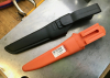 Two Fixed Blade Swedish Knives for one Price! One knife from Mora with black grip and green accent and black, plastic sheath. Bahco knife with black grip and orange accent and orange, plastic sheath. Both blades are stainless steel, machine polished with typical Scandi grinds. Both Made in Sweden! Condition: Mint, as new, never used or sharpened.