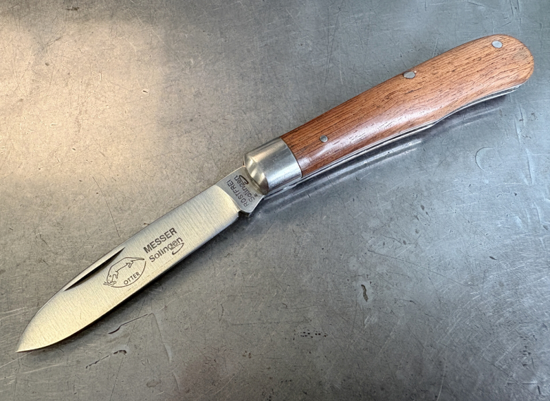 Traditional Otter Single Blade Pocket Knife. This knife is easily 10-15 years old but has not been used. Wooden grips, stainless blade that rests almost centered when closed, no blade rubbing the liners. A nice, classic, old-school style two-hand opening folding pocket knife. I do not believe this exact model is currently in production. The knife has a sturdy back spring Made in Solingen! Condition: Mint, as new, never used or sharpened.