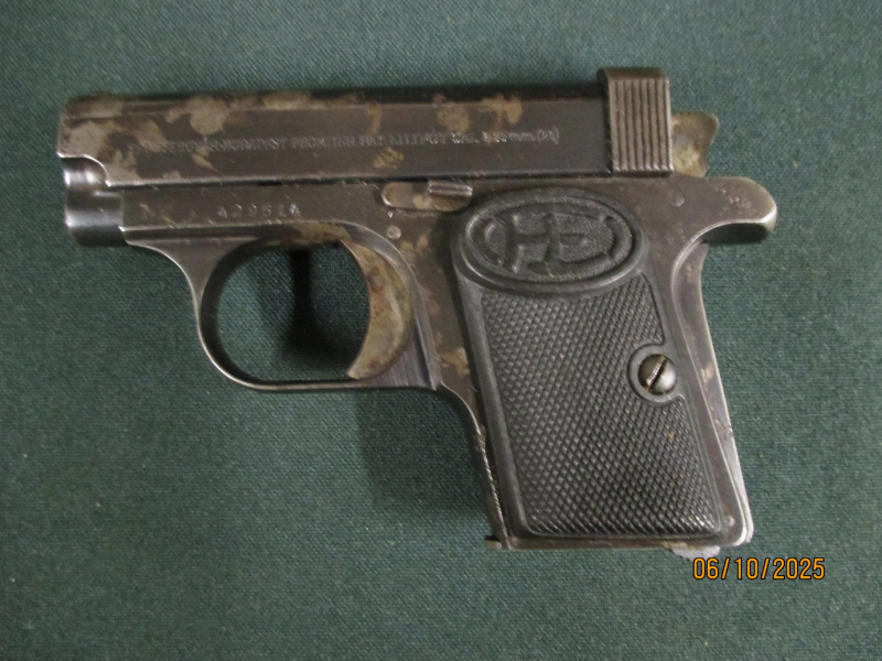 Sammlerstück: Pistole Frommer Lilliput vom Hersteller FEG Budapest im Kaliber 6,35, Brünierung fleckig, sonst guter Zustand