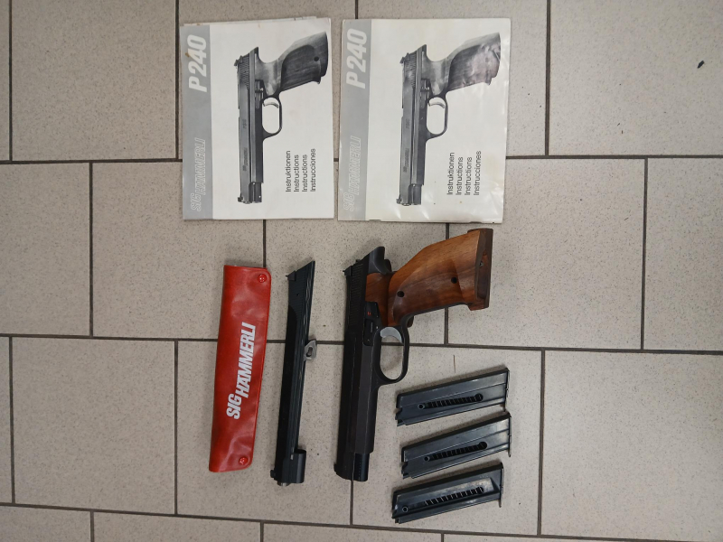 Schöne, wenig gebrauchte SIG Hämmerli P240 im Kaliber .38 Spez. mit Wechselsystem im Kaliber .22lr. Im Lieferumfang enthalten sind zwei Magazine im Kaliber .38 Spez. und eins im Kaliber .22lr. Beide Läufe sind 6 Zoll Läufe.