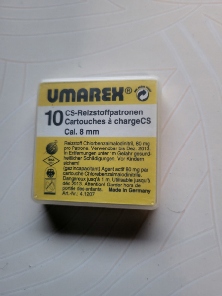 Sie bieten auf eine Packung (10 Stück) Gaspatronen der Fa. Umarex im Cal. 8mm, Abgelaufen 12/2013