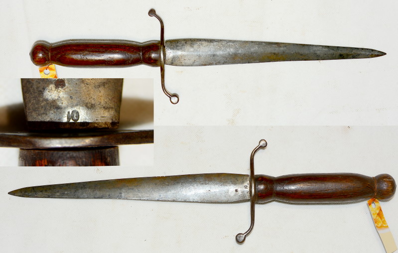Französischer Behelfs-Gabendolch 1. Weltkrieg, Klingenlänge 21,9 cm, vor dem Heft markiert "10", gebrauchter Zustand und ohne Scheide