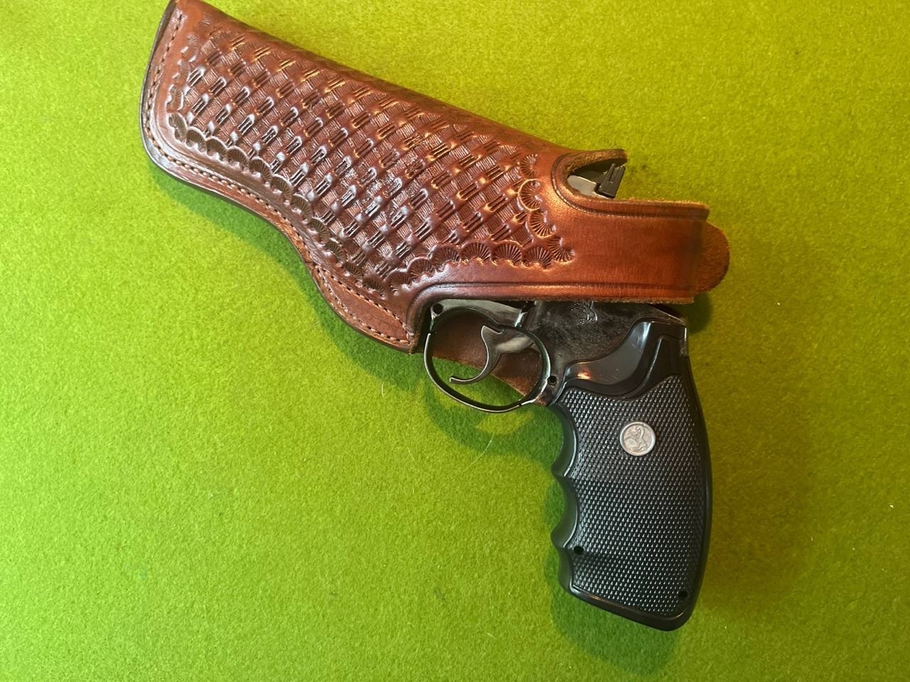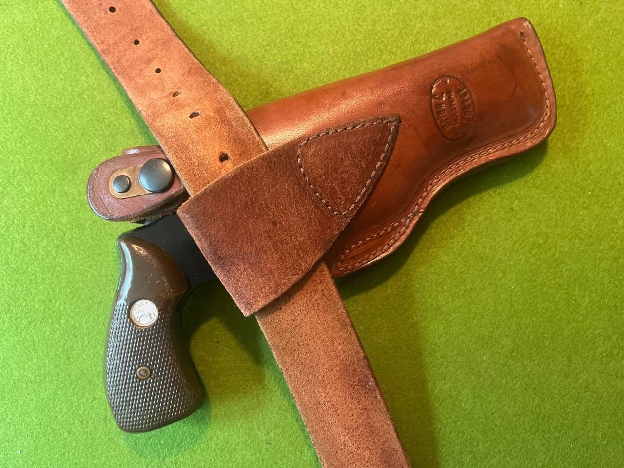 wurdedie Gürtelschlaufe aus dem selben Lederstück des Holsters gewonnen, und sie bietet Platz für einen Gürtel bis eine Breite von gute 50mm.; drinnen ein gut sitzendes Modell eines Colt Revolver, vergleichbar mit der “Cobra“- Familie. Das Teil weist auch die dicke, robuste “Wirbelsäule“