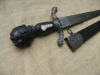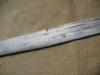 Altes Hieb und Stichschwert mit Sächsischen Wappen auf der Klinge. Centinaranfertigung? Geschnitzter Holzgriff mit Knauf in Form eines antiken Kriegers. Griffstück mit Horneinlage. Eisernes Parierelement mit auslaufenden Fratzenköpfen. Breite Rückenklinge die in eine zweischneidige Spitze ausläuft. Ähnlich wie bei einem Sax. Klinge mit deutlich sichtbaren Schmiedefalten. Scheide aus Leder bezogenem Holzkorpus (dieser meines Erachten später erneuert oder restauriert) Schönes ornamentiertes Mundblech mit Tragering. Gesamtlänge ohne Scheide ca. 88 cm, Klingenlänge ca 70,5 cm, Klingenbreite oben ca. 39 mm. Sehr imposantes Stück.