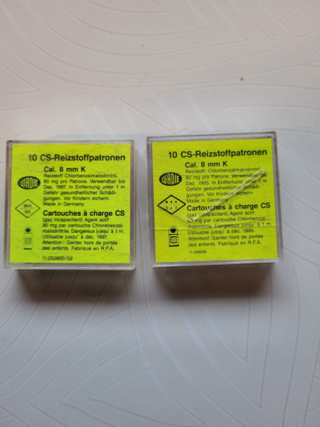 Sie kaufen 1 Packung alte Wadie Gaspatronen im Cal. 8mm Knall, abgel. 12/1995 bzw. 12/1997. Patronen wie neu keine Anlaufstellen o.ä.