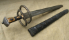 Alter Landsknechts Katzbalger , vermutlich alte Meisteranfertigung des 19. Jahrh. Centinar- oder Festumzugsstück. Griffstück aus abgesetzten Hornstücken mit aufgelegten Rauten. Eiserne Pommel und ornamentierter S- förmiger Parierstange deren Enden in einen Fratzenkopf auslaufen. Breite zweischneidige Klinge mit einer Mittelhohlbahn, im oberen Bereich beidseitig mit Floralen Motiven und der Darstellung von zwei Türmen (vermutlich die Darstellung der Türme von Jericho). sowie mit der alten zugehörigen Scheide.