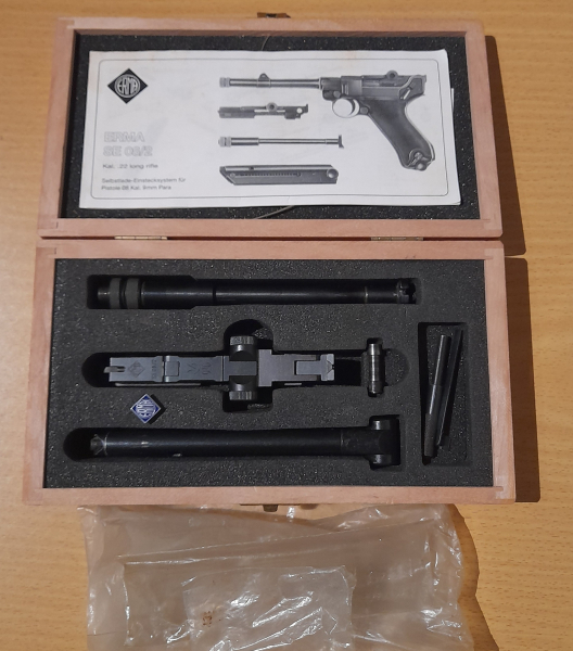 Hallo ich verkauft hier nun wieder ein Stück aus meinem Fundus. Ein Erma Einsteck-Wechselsystem 08 von 9mm Luger auf 22lfb den ich vor etlichen Jahren mal erworben habe. Ich habe ihn bis zum heutigen Tage nie gebraucht oder ihn eingesetzt und hat bei mir nicht einmal ein paar Probeschüsse mit gemacht. Der Einstecklauf ist noch in den Original Plastiktütchen verpackt – ich habe sie nur zur Fotografie herausgenommen. Es ist sogar noch die übliche kleine Anstecknadel von Erma mit dabei – der Einstecklauf ist kompl. Mit Kasten – Begleitheftchen und allen Teilen Jungfräulich und Unbenutzt. Zum Erwerb muss eine P08 in ihrer WBK eingetragen sein. Bitte sich das Bild ansehen, auf Wunsch kann ich aber noch welche zusenden. Und zum Schluss noch das Übliche dies ist ein Privatverkauf daher Garantie - Rückgabe - Umtausch und der gleichen Ausgeschlossen.