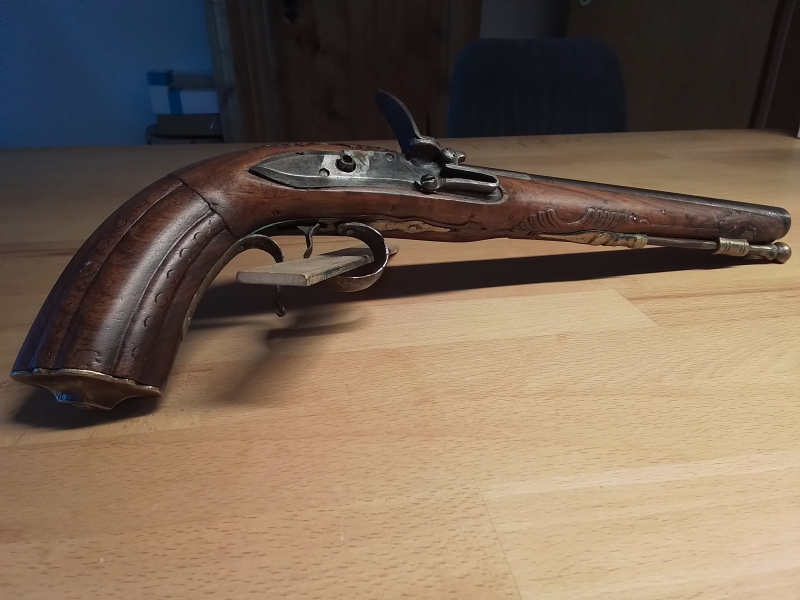 Schöne Steinschloss Pistole zum herrichten für Bastler oder als Teile Träger, Hahn fehlt, Schloss augenscheinlich ok. Sehr schöne Messing Beschläge teils graviert. Gesamtlänge 37 cm , Lauf 25 cm von 8 Kant in rund übergehend ohne Züge . Schöne schaftverschneidungen Nussbaumholz in einem schönen Zustand, . Verkauf als defekt