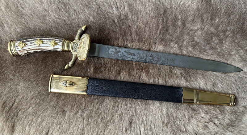 Auflösung einer Eickhorn Sammlung.---Hirschfänger , 3 aufgelegte Eicheln, vergoldete Beschläge, verzierte Klinge und Rücken. Gesamtlänge 49,2 cm