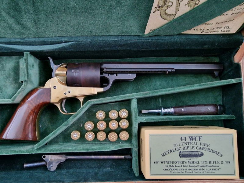 Western Navy 1851 Conversion Modell. Kaliber 9mm. PTB 287/2. Sehr gut erhaltener Revolver in repräsentativer Holzschatulle mit etwas Zubehör (die Pappschachtel mit Munition ist leer).