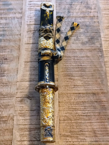 Die Gesamtlänge = 42 cm, Grifflänge = 12,5 cm, Klingenlänge mit Habaki = 24,5 cm
