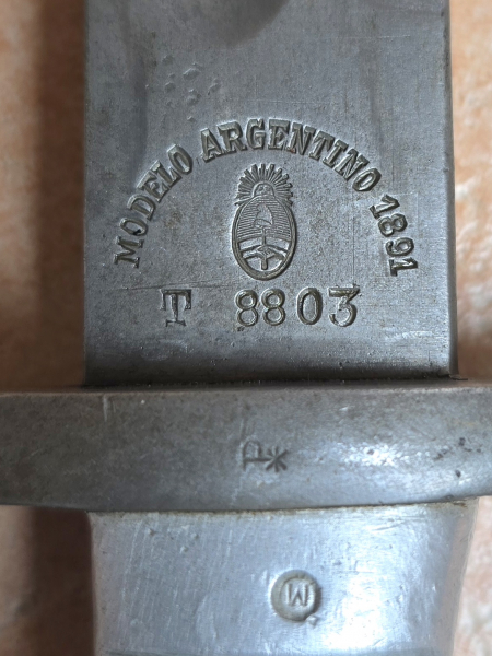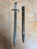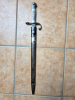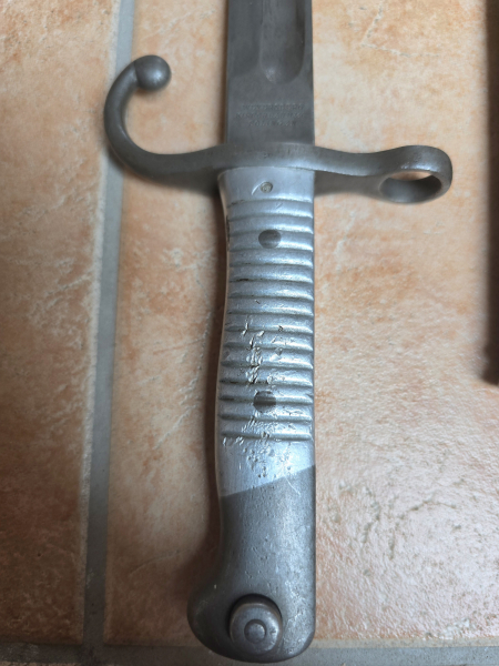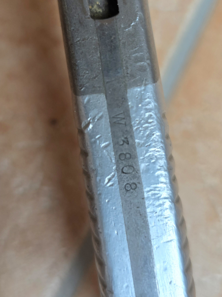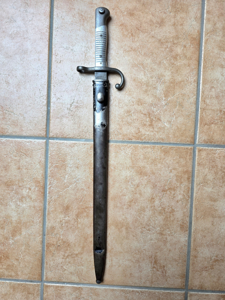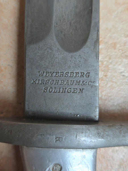 Das Bajonett befindet sich im gezeigten Zustand. Die Scheide hat im unteren Bereich einen Knick und lässt sich bis auf ca. 1cm einstecken. Die Bestempelungen sind alle vorhanden, das Wappen ist jedoch nicht herausgeschliffen.