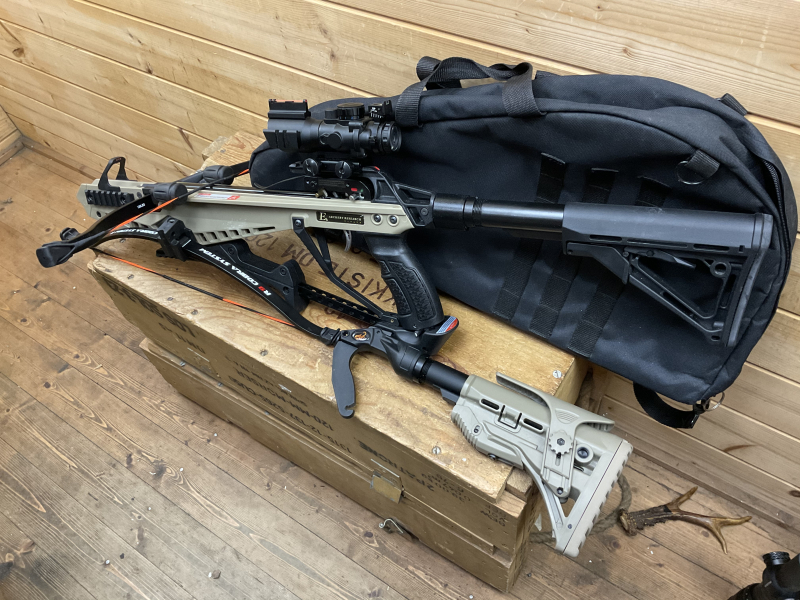 Armbrust mit Metall-Spannhebel! 2 Hinterschäfte längenverstellbar! 2 Wurfarme! Schaft und Wurfarm schnell und einfach austauschbar! Red Dot rot/grün/blau, mit Original Futteral! Pfeilgeschwindigkeit ca. 252km/h! fast neuwertiger Zustand!!! siehe Bilder!