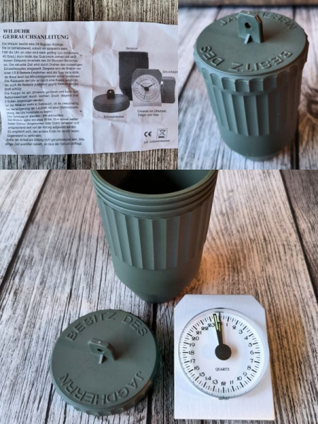 Die Wilduhr mit einem Quarzwerk wird mit einer LR 6-Batterie (AA) betrieben. Eine passende Batterie lege ich bei.