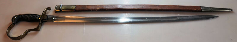 im schönen Zustand, Hersteller ist Waffenfabrik Neuhausen, Seriennummer 15268 darunter 42, Lederscheide mit Eisenbeschläge die Naht ist geschlossen, der Griff ist auch Magentisch, Gesamtlänge ca. 83 cm Klingenlänge ca. 70cm Klingenbreite ca. 2,5 cm