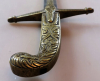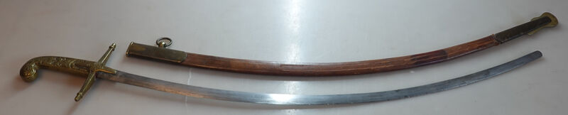 Griff ist aus Messing und reich verziert, die Klinge ist aus Stahl, die Scheide aus Leder mit Messingbeschlägen, sehr schönes Stück Gesamtlänge ca. 91 cm Klingenlänge ca. 78 cm keine Ahnung wie alt und aus welchem Land