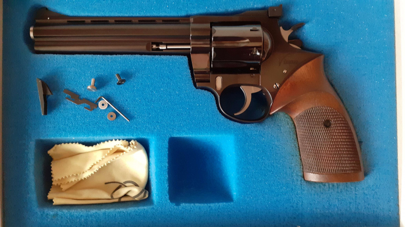 Zum Revolver gehören noch einige Zubehörteile. Das wären ein Kimmenblatt und ein entsprechendes Korn, zwei Rollen mit denen das Abzugsgewicht korrigiert/verändert werden kann, ein Inbusschlüssel und zwei Teile deren Bedeutung ich nicht kenne (siehe Foto). Eine Beschreibung konnte ich nicht finden. Zum Revolver gehört noch der entsprechende Pappkarton der auch auf einem Foto erkennbar ist. Dieses ist ein privater Handel. Garantie, Rücknahme sowie Nachverhandlungen werden nicht akzeptiert.