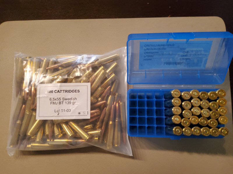 Zum Verkauf steht eine Packung Bulkware mit 100 Patronen sowie 30 Patronen aus einem Bulkpack in einer blau-transparenten Munitionsbox.