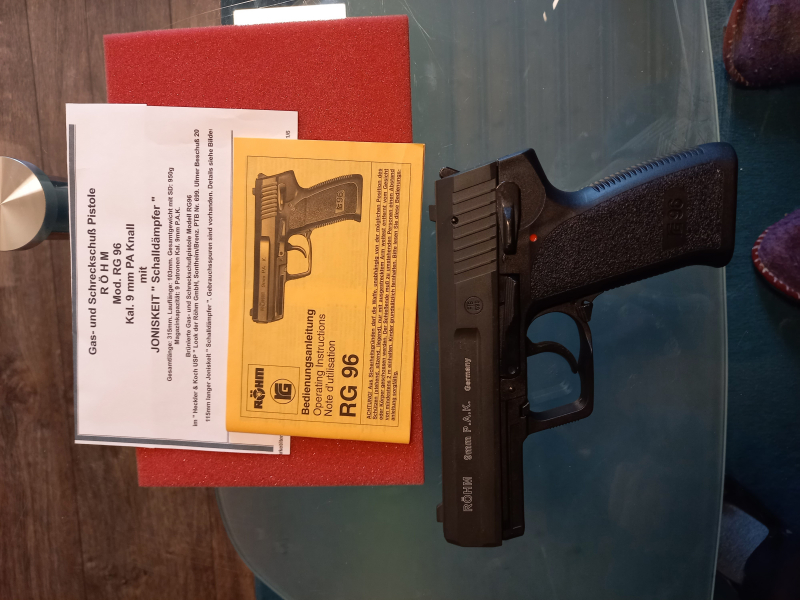 Sie bieten auf eine neuwertige Gas- u. Schreckschusspistole Röhm Mod. RG96. Cal. 9mm PA Knall mit Abschußbecher, Putzbürste, Bedienungsanleitung und Karton. Kartondeckel leider etwas mitgenommen aus der alten Vorgängerserie. Ich habe die Pistole als leicht gebraucht gekauft aber nicht einmal abgefeuert. Magazinkapazität 9 Patronen, Cal. 9mm PA. PTB 699. Die Pistole ist neuwertig und die Trockenfunktion ist bestens. Eine sehr hochwertige Waffe, sehr sauber verarbeitet mit noch vielen Stahlteilen. Kenner lieben diese Modell RG 96. Sie funktioniert mit jeden neueren Munition. Verkauf nur an Personen über 18 Jahren, Altersnachweis erforderlich. Privatverkauf keine Garantie oder Gewährleistung, kein Umtausch oder Rücknahme. Verkauf nur innerhalb der EU. Versandkosten nur für Deutschland, für EU Versand bitte vorher Kosten anfragen. Viel Spaß beim bieten!
