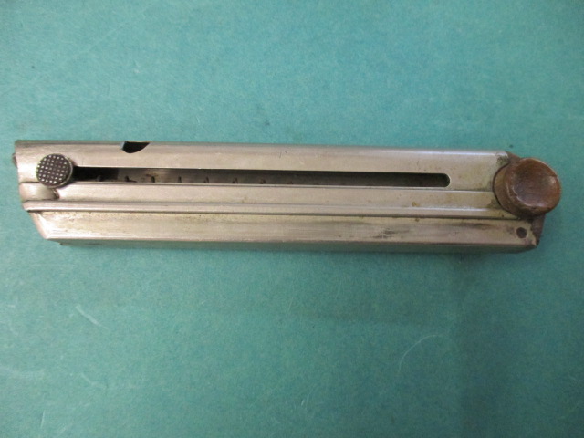 Angeboten wid ein originales , sehr gut erhaltenes Magazin für die Pistole 08 des ersten WK . Kein Rost ,sehr gute Funktion ,typische Stempelung des Holzbodens .