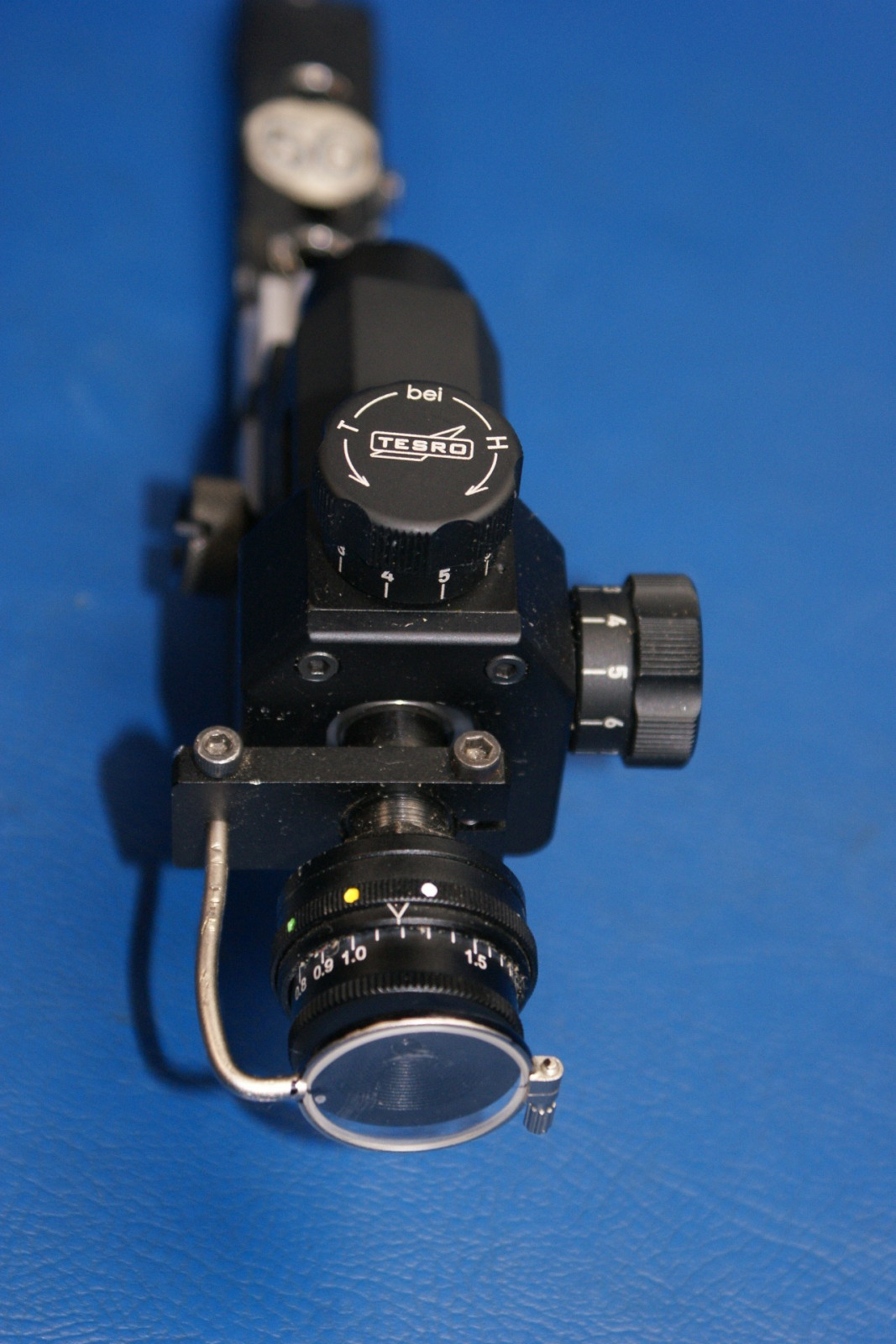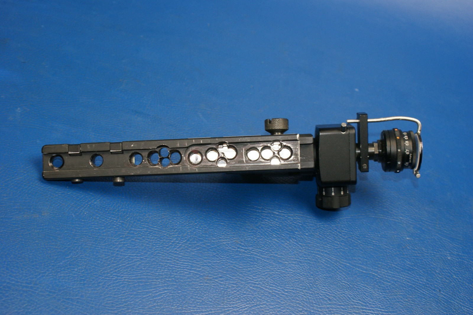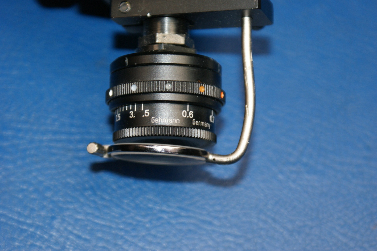 Mit Gehman Farbfilter (6 Farben), verstellbarer Irisblende und Ringkorn samt Erhöhung. Gebrauchsspuren.