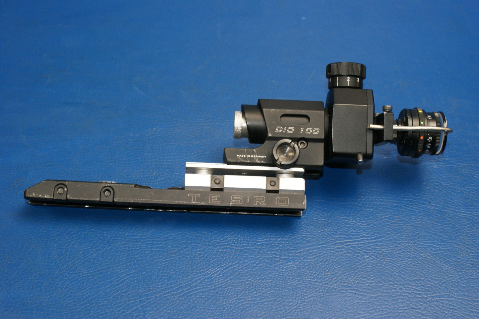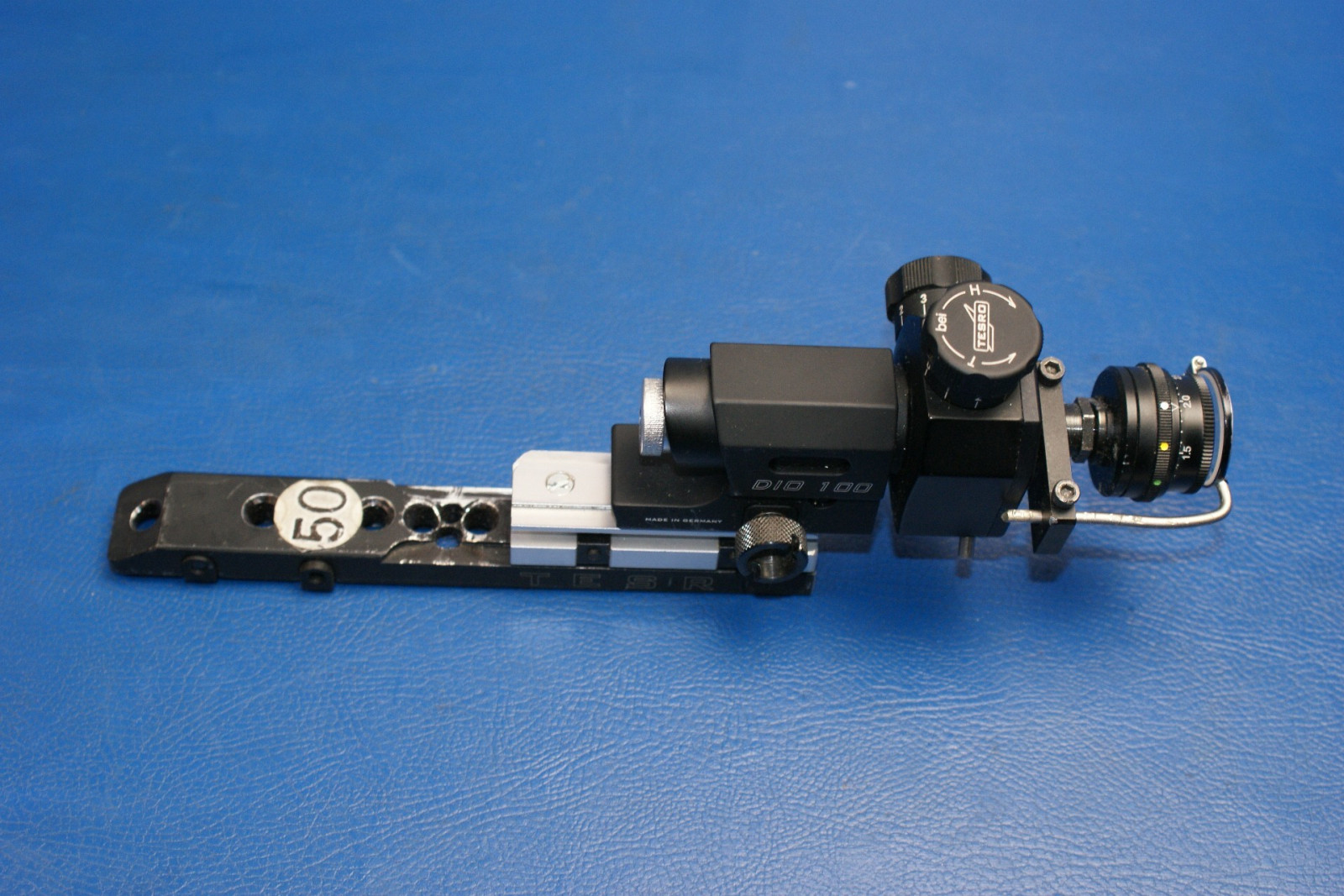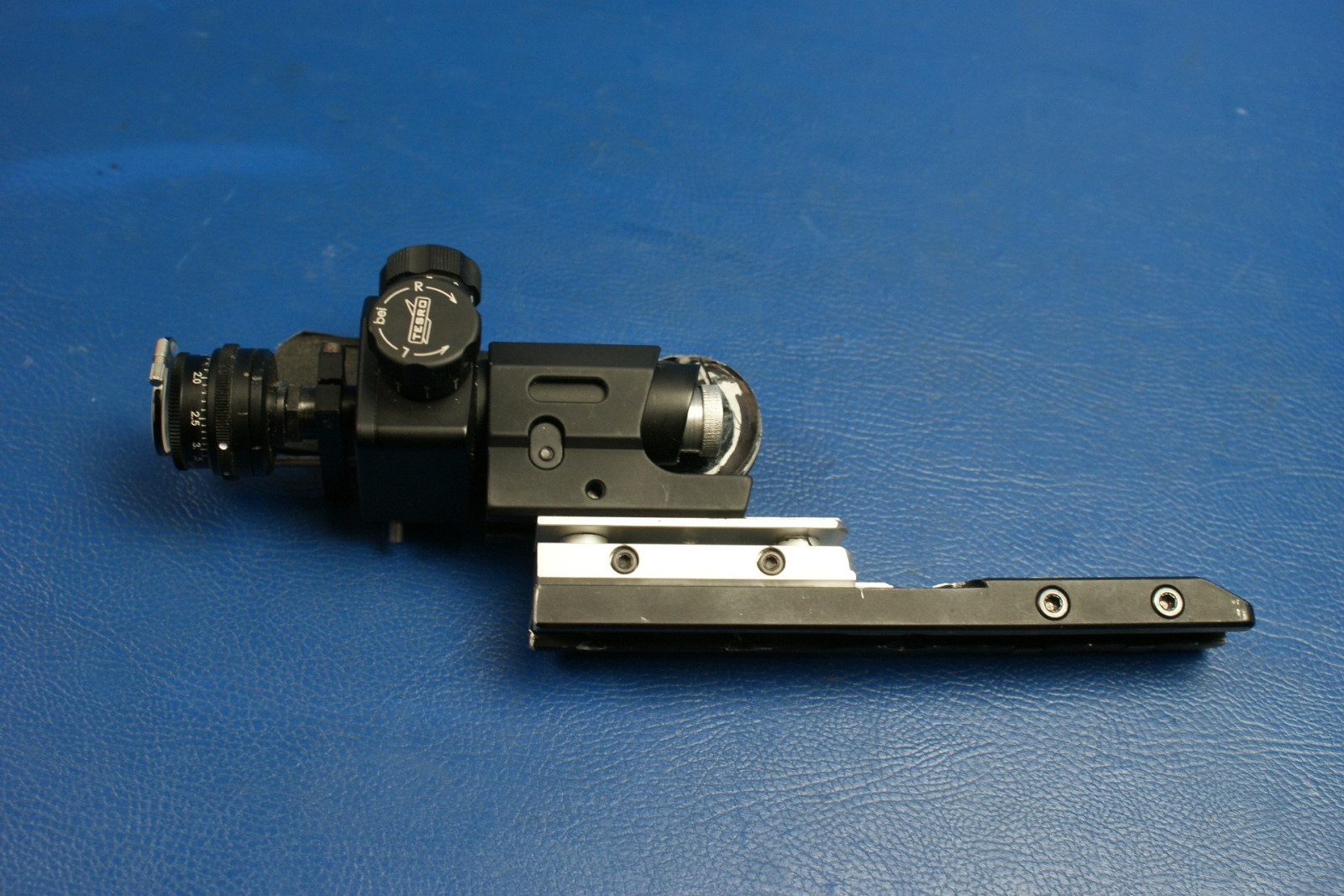 Mit Gehman Farbfilter (6 Farben), verstellbarer Irisblende und Ringkorn samt Erhöhung. Gebrauchsspuren.