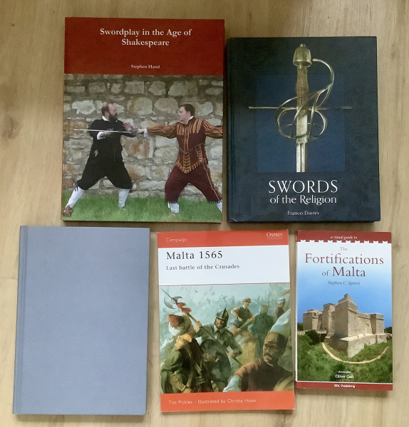 Ich biete hier ein Bücher-Konvolut zum Thema Schwertkampf, Historisches Fechten, Mittelalter und Renaissance an. Dabei u.a. Die selten zu bekommenen Bücher Swords of the Religion (nur auf Malta erhältlich) und Swordplay in the Age of Shakespeare von Stephen Hand. Dazu Melville’s. Twohanded Swords über alles, was mit Zweihandschwertern, Montante usw. Zu tun hat, sowie zwei Bücher zur Belagerung Maltas und dem dortigen Festungsbau. Gelesener, aber sehr guter Zustand. NP zusammen 250 Euro. Da es sich bei dieser Auktion um einen gebrauchten Artikel handelt, gewähre ich keine Garantie und kein Rückgaberecht (siehe EU-Recht).