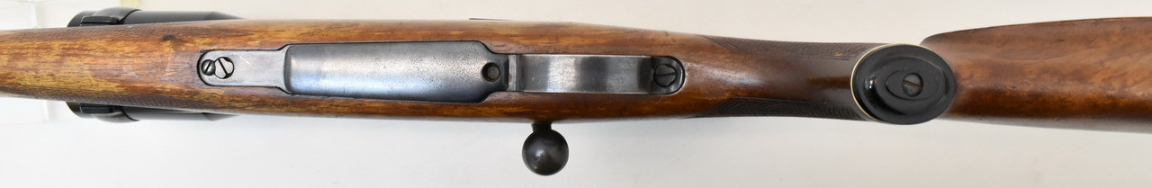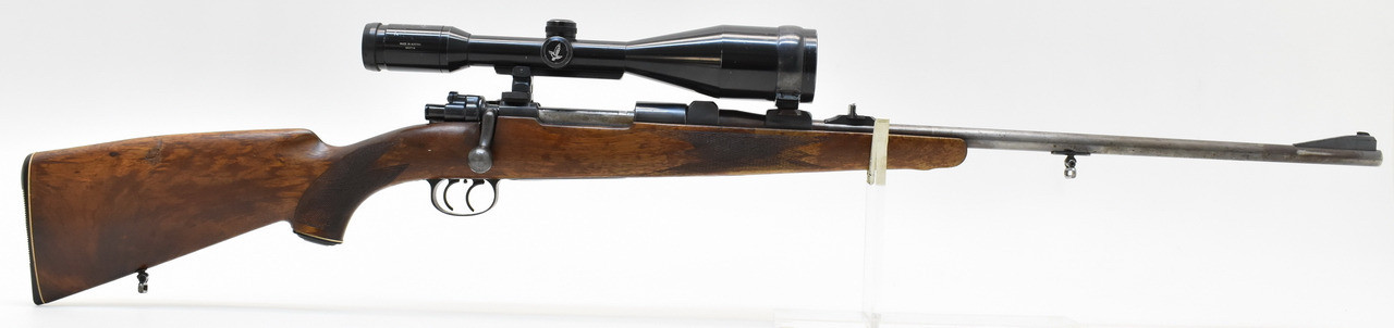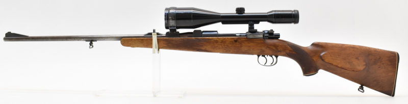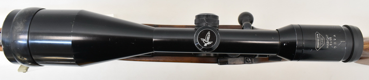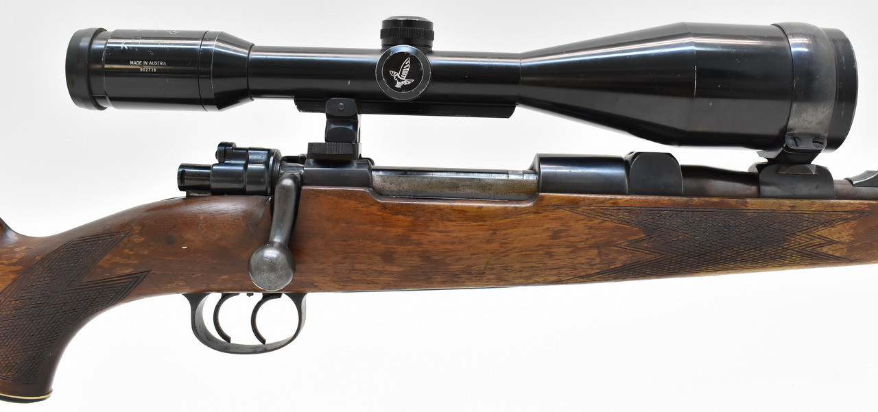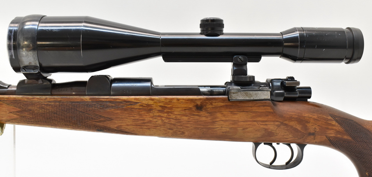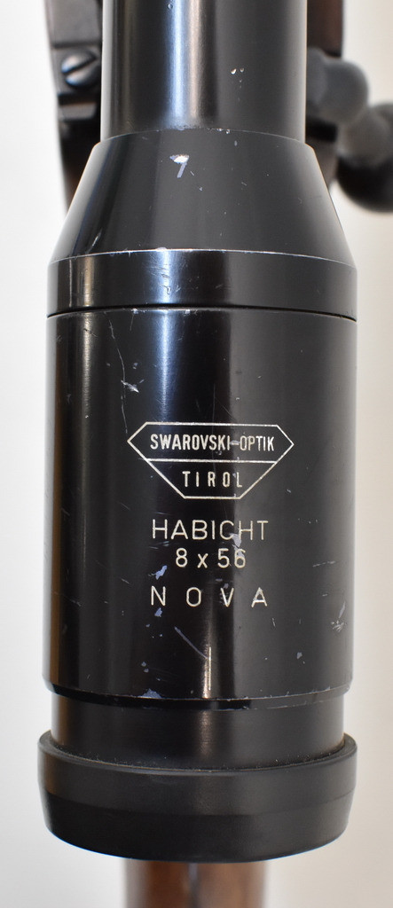Klassischer Jagdrepetierer System 98 mit deutschem Stecherabzug, Flügelsicherung und festem Magazin. Der Lauf ist blank, die Brünierung ist stark berieben. Die Feder des Schloßhalters ist schwach, Schloß wird aber gehalten. Schaftlänge 37cm ( gemessen Abzug bis Mitte Schaftkappe) Montiert mit einem Swarovski Habicht Nova ZF 8x56 Abs. 4 mittels einer Schwenkmontage. Beschuss von 02/1968.
