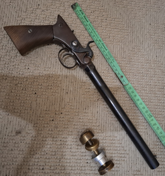 Die Pistole ist ca 42 cm lang und über 1200 Gramm schwer , Kaliber .40 ( RK .395 + Pflaster ) , trocken und ähnlich wie bei einer modernen Sportpistole auslösender Direktabzug , höhenverstellbares Visier , seiltlich verschiebbares Perlkorn , innen blanker Lauf ohne Narben/Närbchen mit 4 Zügen .