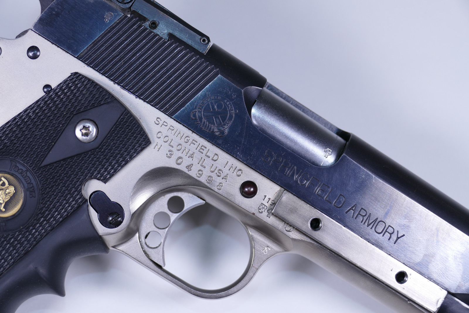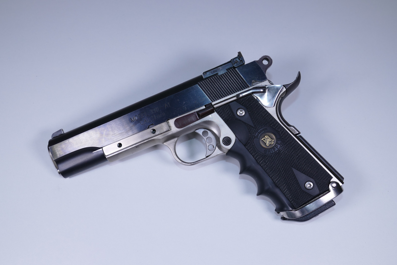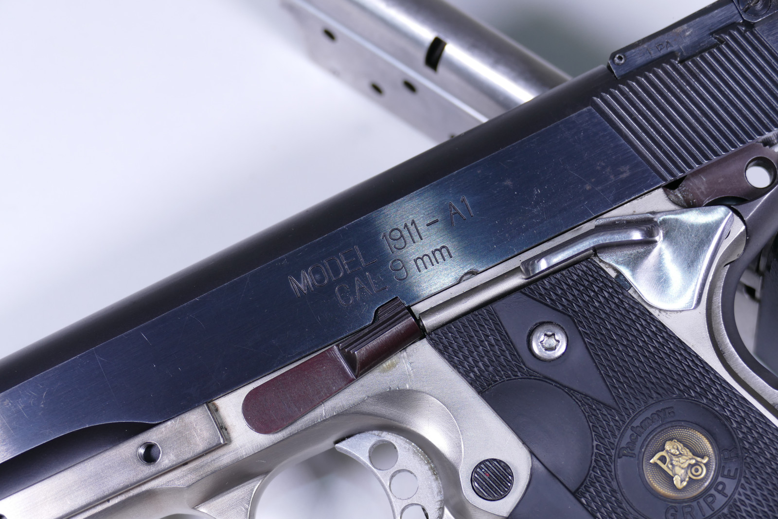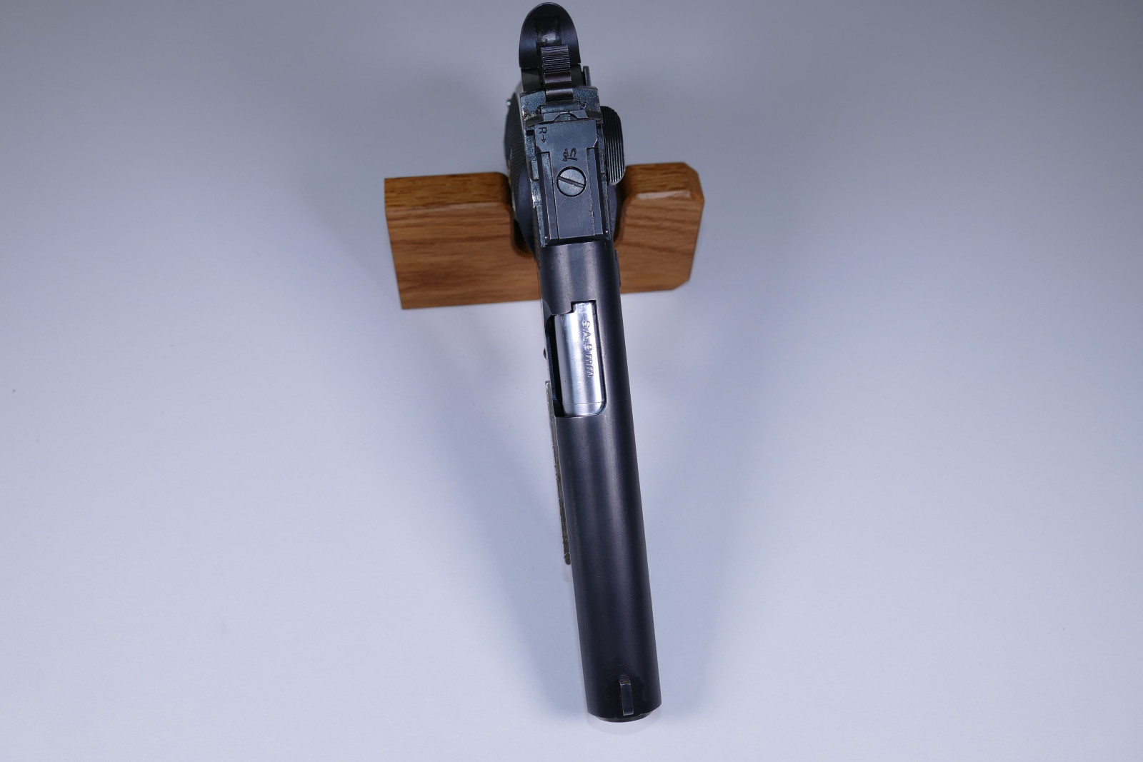 Zum Verkauf kommt hier eine gepflegte Springfield 1911 A1 im Kaliber 9mm Luger in Bicolor. Die Waffe ist gebraucht, aber sehr gepflegt. Der Verschluss läuft mit wenig Spiel, der Abzug kommt trocken. Montiert sind ein Micrometervisier, Pachmayr-Griffschalen, Magazintrichter sowie eine Montagevorrichtung für eine Brückenmontage. Diese wurde offensichtlich nicht verwendet. Mit dabei sind insgesamt vier Magazine. Zum Zustand schauen Sie sich bitte die Bilder an. Viel Spaß beim Bieten!