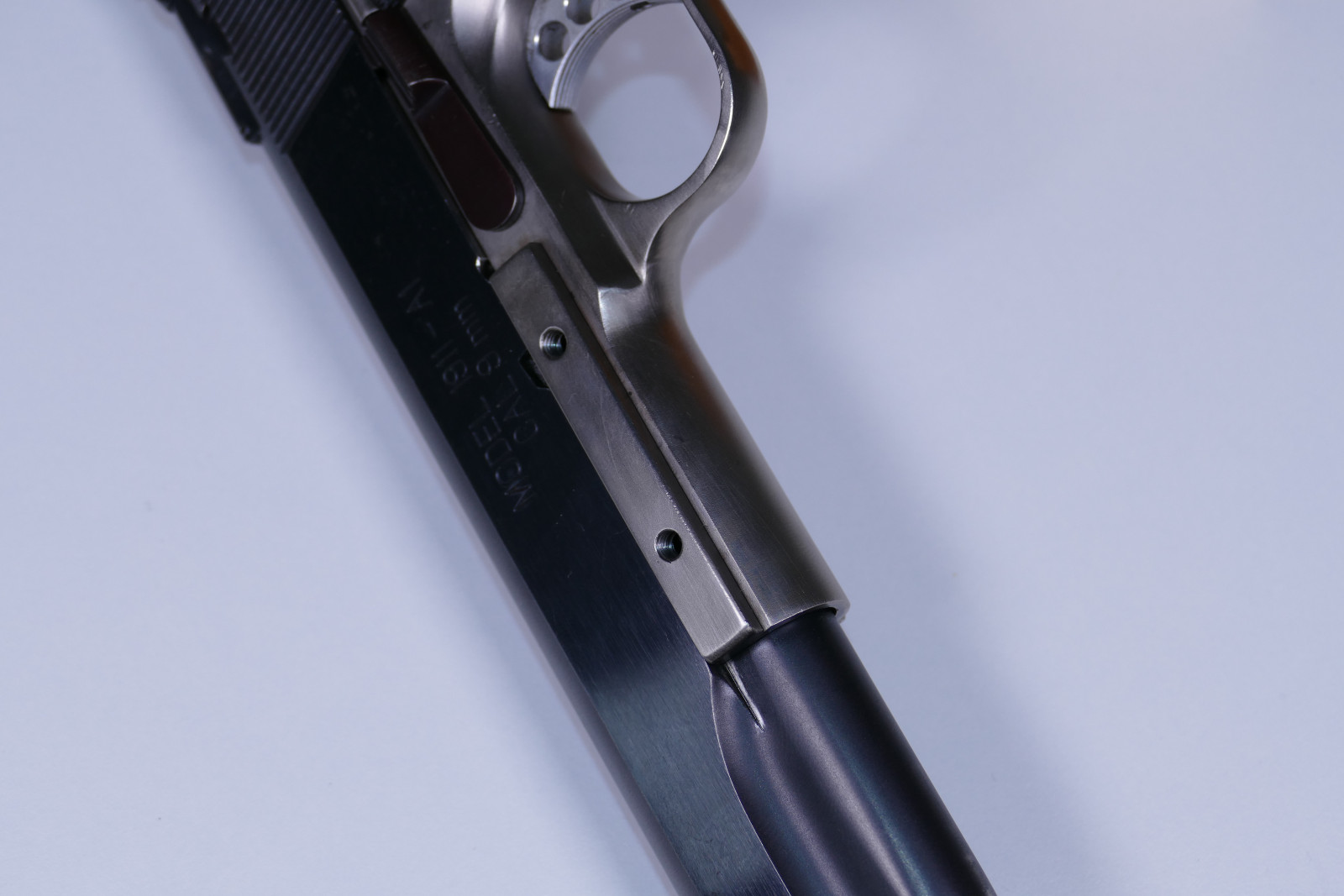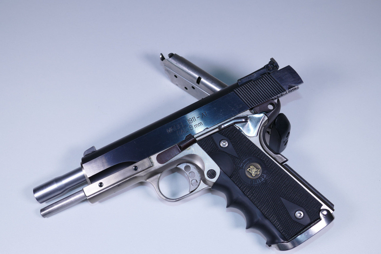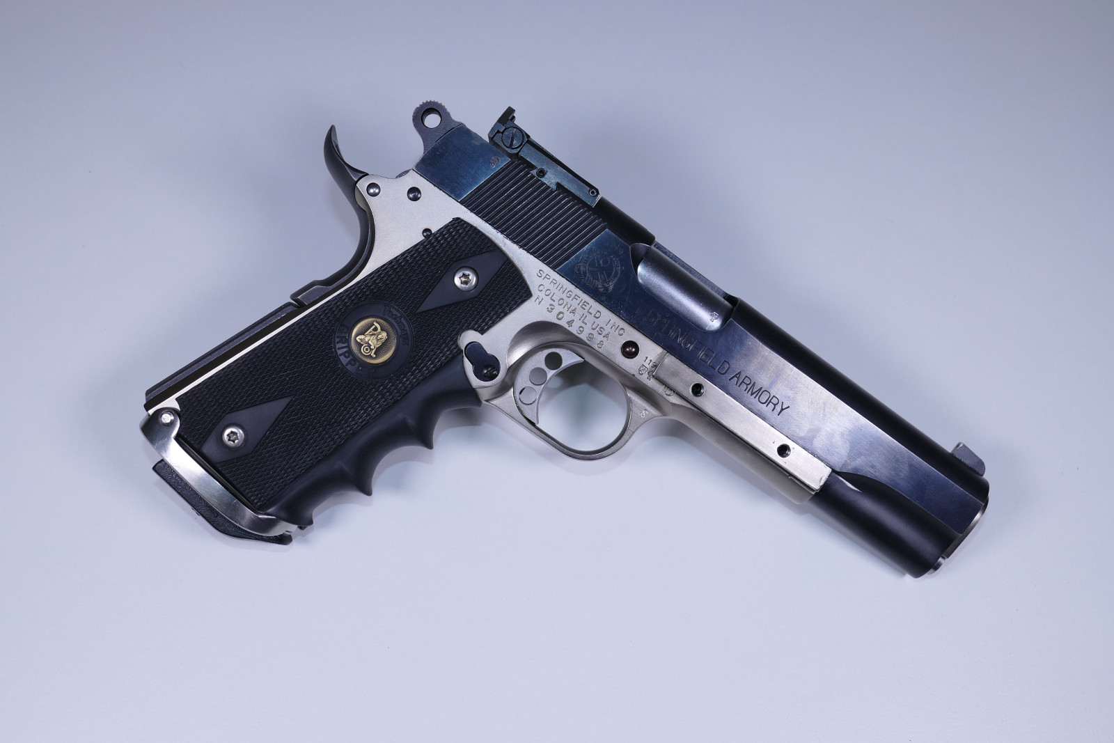 Zum Verkauf kommt hier eine gepflegte Springfield 1911 A1 im Kaliber 9mm Luger in Bicolor. Die Waffe ist gebraucht, aber sehr gepflegt. Der Verschluss läuft mit wenig Spiel, der Abzug kommt trocken. Montiert sind ein Micrometervisier, Pachmayr-Griffschalen, Magazintrichter sowie eine Montagevorrichtung für eine Brückenmontage. Diese wurde offensichtlich nicht verwendet. Mit dabei sind insgesamt vier Magazine. Zum Zustand schauen Sie sich bitte die Bilder an. Viel Spaß beim Bieten!