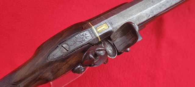 Sie bieten auf gute Steinschlossflinte von Manton in London, ca. 1780. Die Gesamtlänge beträgt ca. 116 cm, der 77 cm lange Lauf hat das Kaliber 15 und geht nach Achtkant auf 16 über und nach 3-fachem Baluster in rund. Er ist in Gold mit der typischen Meistermarke signiert (siehe Der neue Stöckel, Band 2, Seite 752/53). Die Schlossplatte ist mit einer Randstichgravur versehen und ebenfalls „MANTON“ bezeichnet. Die Batterie ist rollen- gelagert. Das Zündloch ist Gold gefüttert Der Schaft aus feinstem Nussholz ist schön gemasert und mit einer feinen Fischhaut versehen. Der originale Ladestock hat einen Hornabschluss.