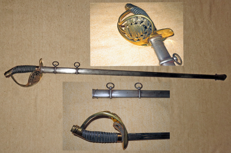 Der seltene sächsische Degen mit Eisenscheide (2 Trageringe) hat ein Messingbügelgefäß mit im Korb integriertem sächsischen Wappen, Fingerschlaufe und einen mit Fischhautbesatz sowie 2-fachen intaktem Draht umwickelten Griff.