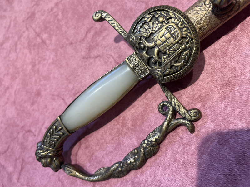 Der Griffbügel sitzt locker im Löwenkopfknauf, die beiden Griffschalen (Kunststoff??) und die beiden Bänder vorne/hinten sind ersetzt worden.