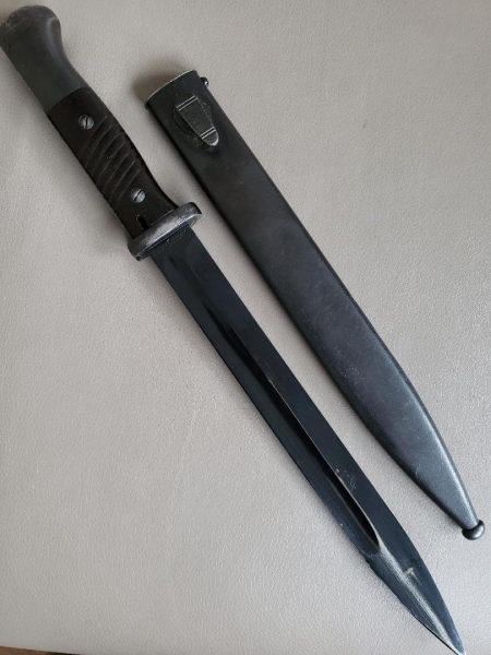 Biete aus Jägernachlaß sehr schön erhalten gebliebenes 98k Bayonett der Marke -Elite Diamand- Das Bayo ist von 1940 u. ist nicht nrgleich /Herstellergleich mit der Scheide!Beides ist aber in einem orginalen Zustand,nichts beschliffen oder umgestempelt.Auch wenn Nr. mässig nicht zusammengehörig,schönes Stück mit Geschichte.Klinge ist unbeschliffen gerade u. ohne Macken!Lediglich Macken durch Benutzung-klopfen- auf dem Feuerleitblech!Für mehr Bilder gerne melden.Versende ausdrücklich nur innerhalb Deutschlands u.Altersnachweis!Kein Rost oder Rostnarben! Scheide ist von dem selteneren Hersteller Jetter u.Scheerer Tutlingen 1938 !Danke für den netten Hinweis!