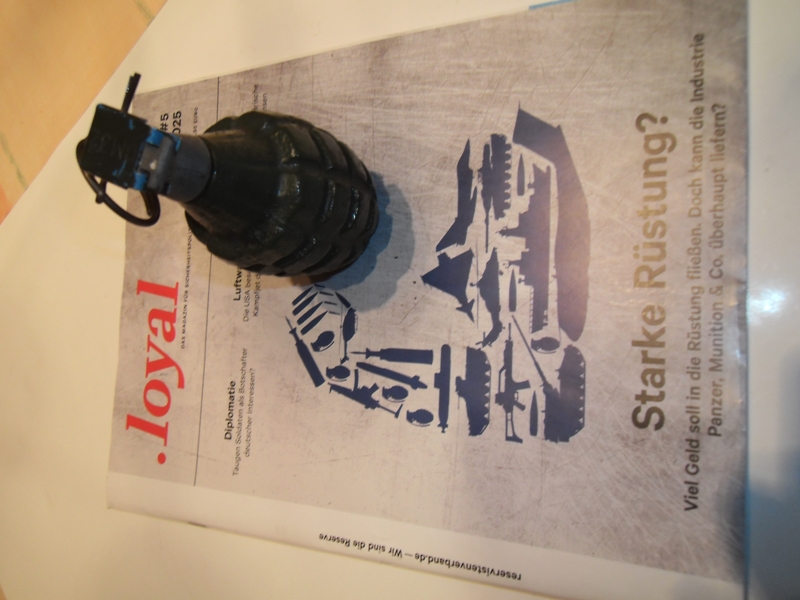 DM32 Handgranate, auch Pineapple (Ananas) genannt. Hier handelt es sich um einen Dekorationsartikel ohne Funktion, hohl und ohne Stoffe von denen irgendeine Gefahr ausgehen könnte. Original, Höhe ca. 11 cm, Durchmesser 5,5 cm, Gewicht: ca. 100 g. Zusätzlich Heft Loyal Nr. 5 aus 2025.