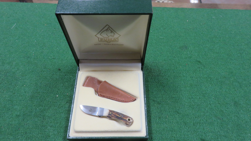 1 Originales Puma Mini Messer " Integral Skinmaster " mit Lederscheide. Gasamtlänge: 6 cm. Klingenlänge : 2.3 cm. Das Messer ist neu / unbenutzt und befindet sich in der Originalen Luxusbox, Hirschhorngriffschalen.