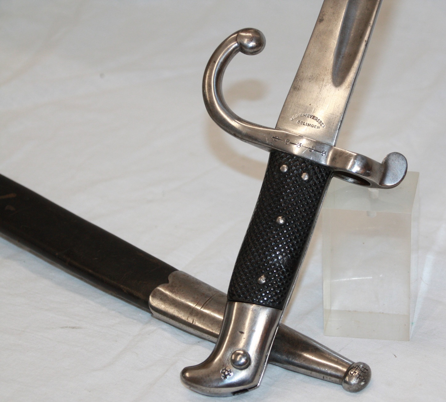 Komplett mit Scheide. Hersteller: Weyersberg, Solingen. Nummerngleich.